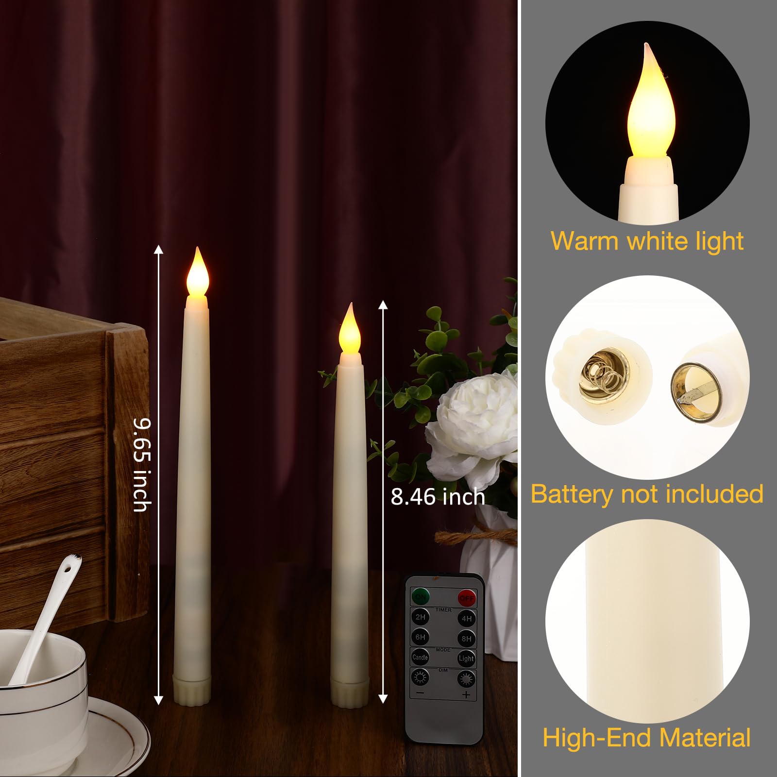 | Number of Pieces | 50 pcs flameless taper candles + 4 remote controls |