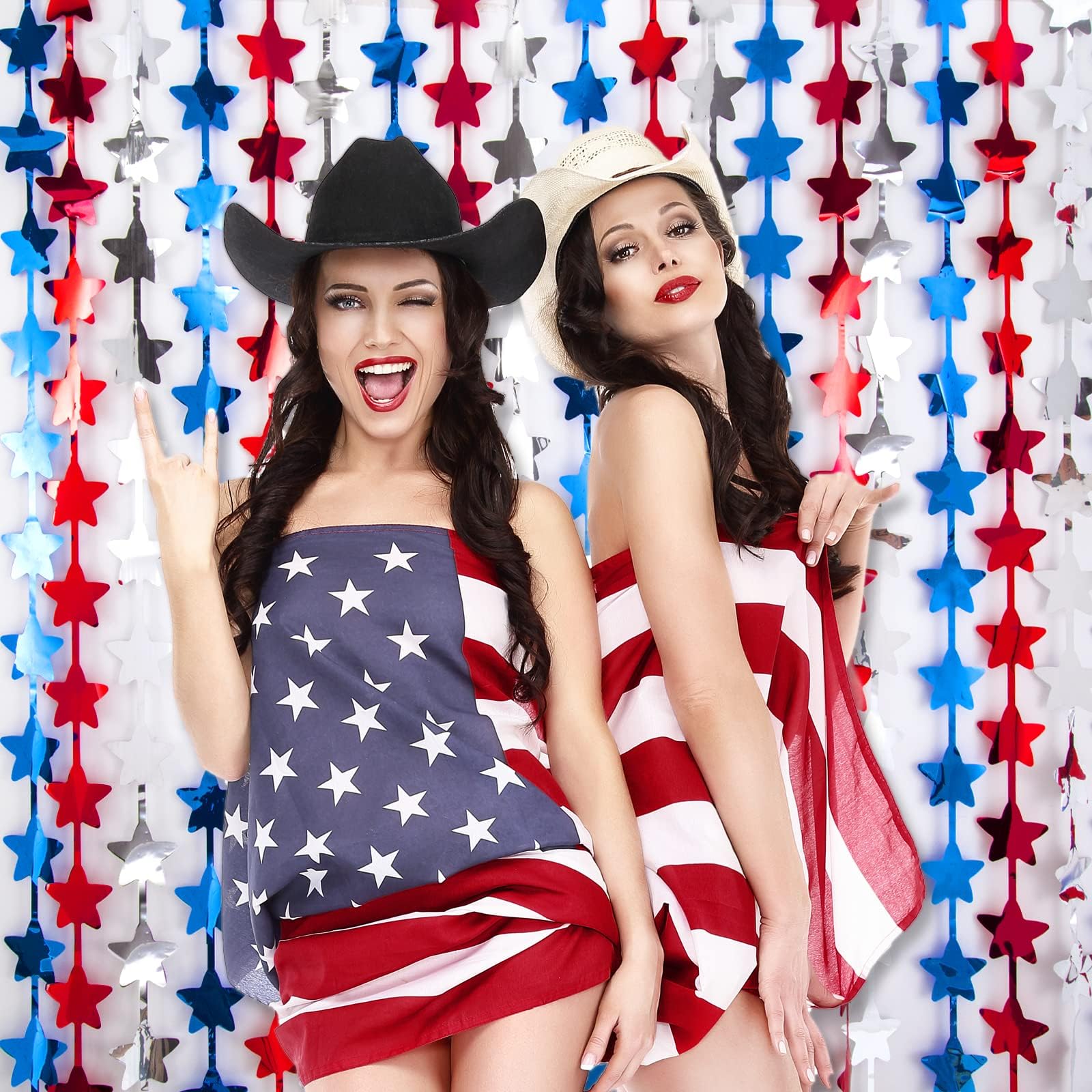 The curtain tinsel consists of premium red, white and blue metallic star hanging curtains designed for 4th of July party backdrops, doorways, windows and retail event displays, with each piece measuring 3.3 feet by 6.6 feet and constructed from high quality durable material.