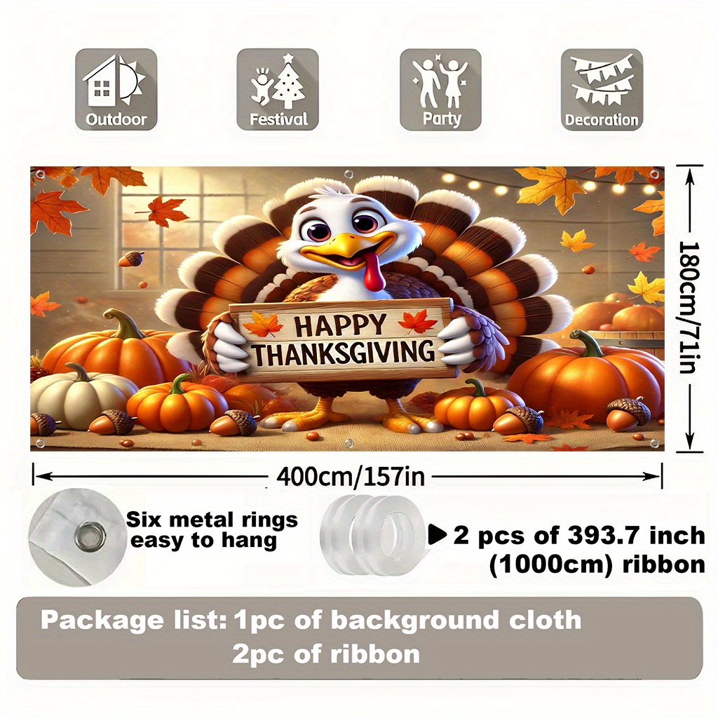 PartyDecorpro: As a professional custom backdrop banner manufacturer, we provide factory-direct wholesale polyester backdrop supplier services with full OEM/ODM. This vibrant Thanksgiving turkey backdrop banner features cute turkey & pumpkin design. Perfect for custom holiday needs with options for logo, pattern and size.