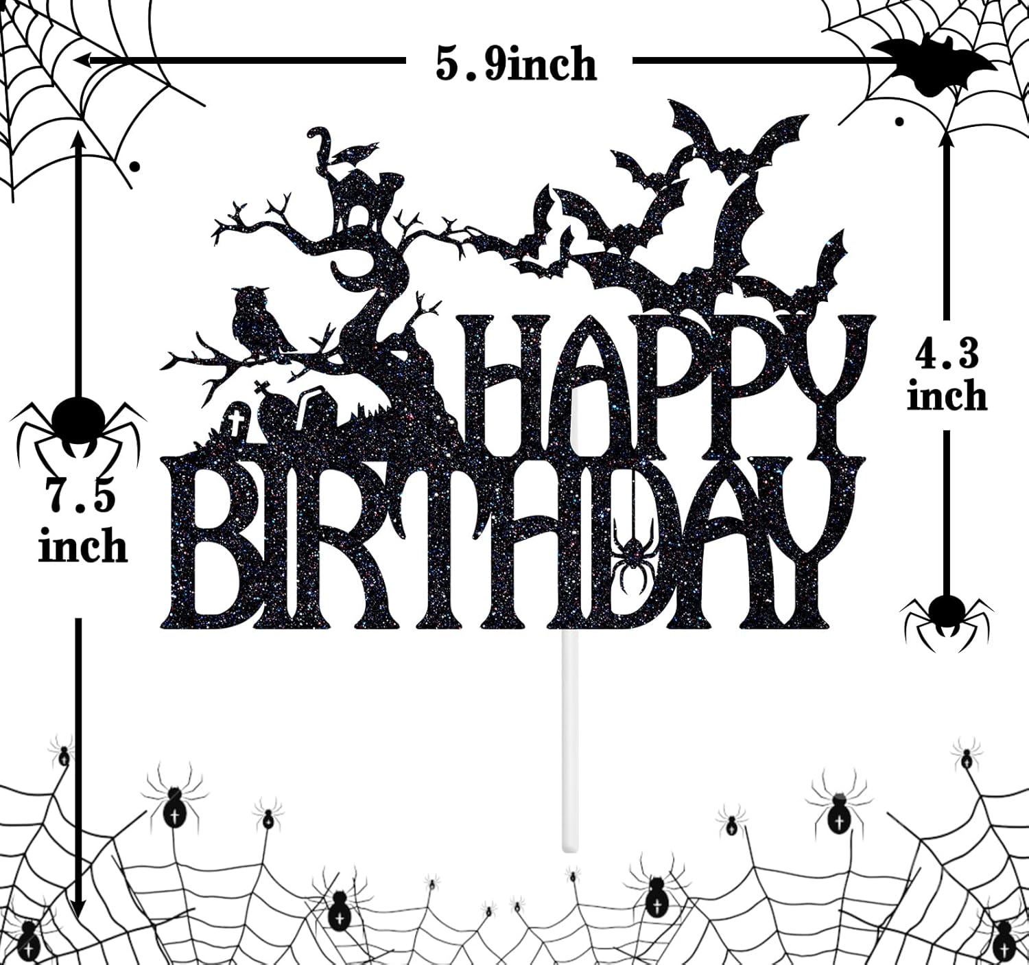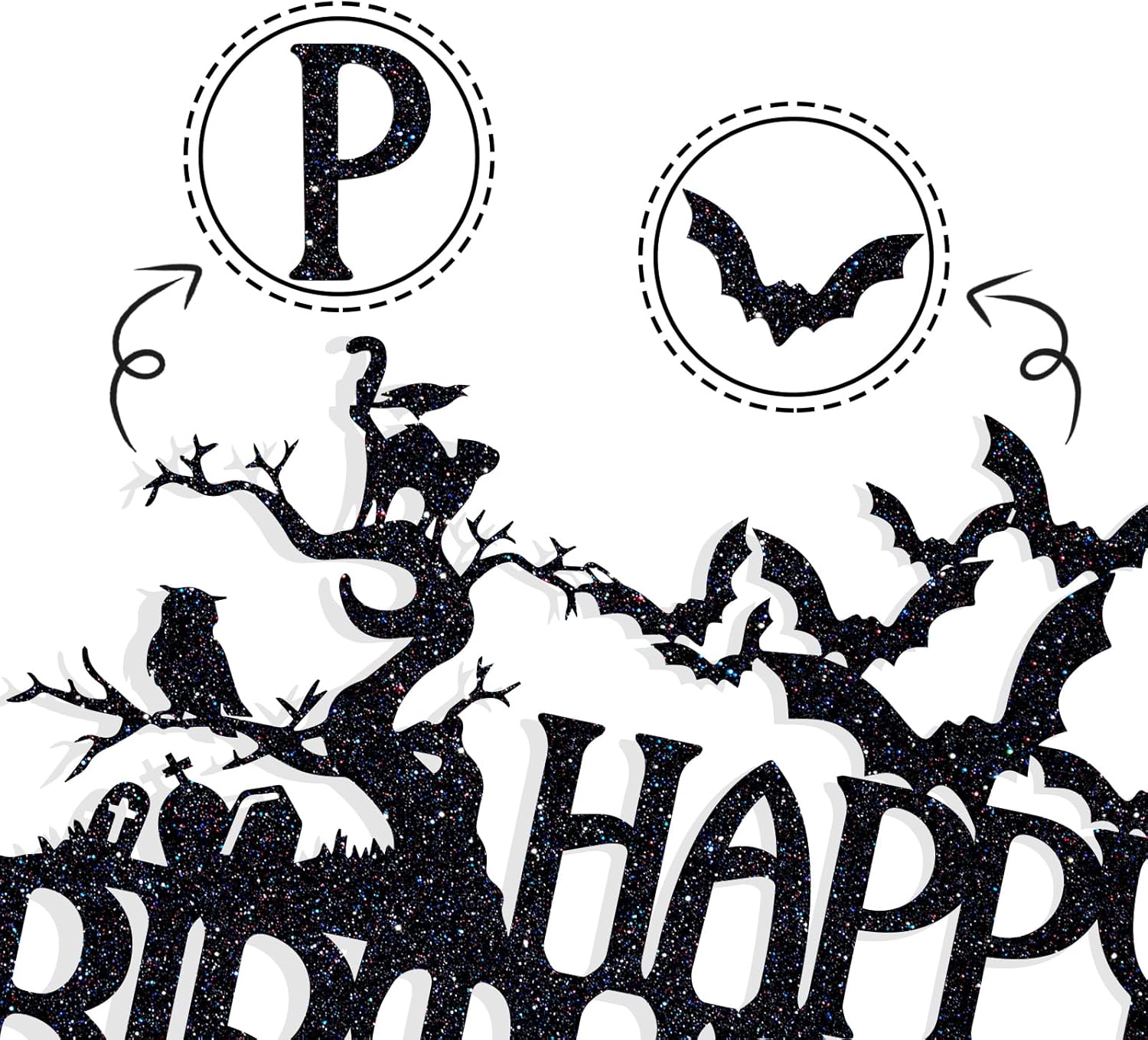Halloween Happy Birthday Black Glitter Cake Topper – Haunted House Design