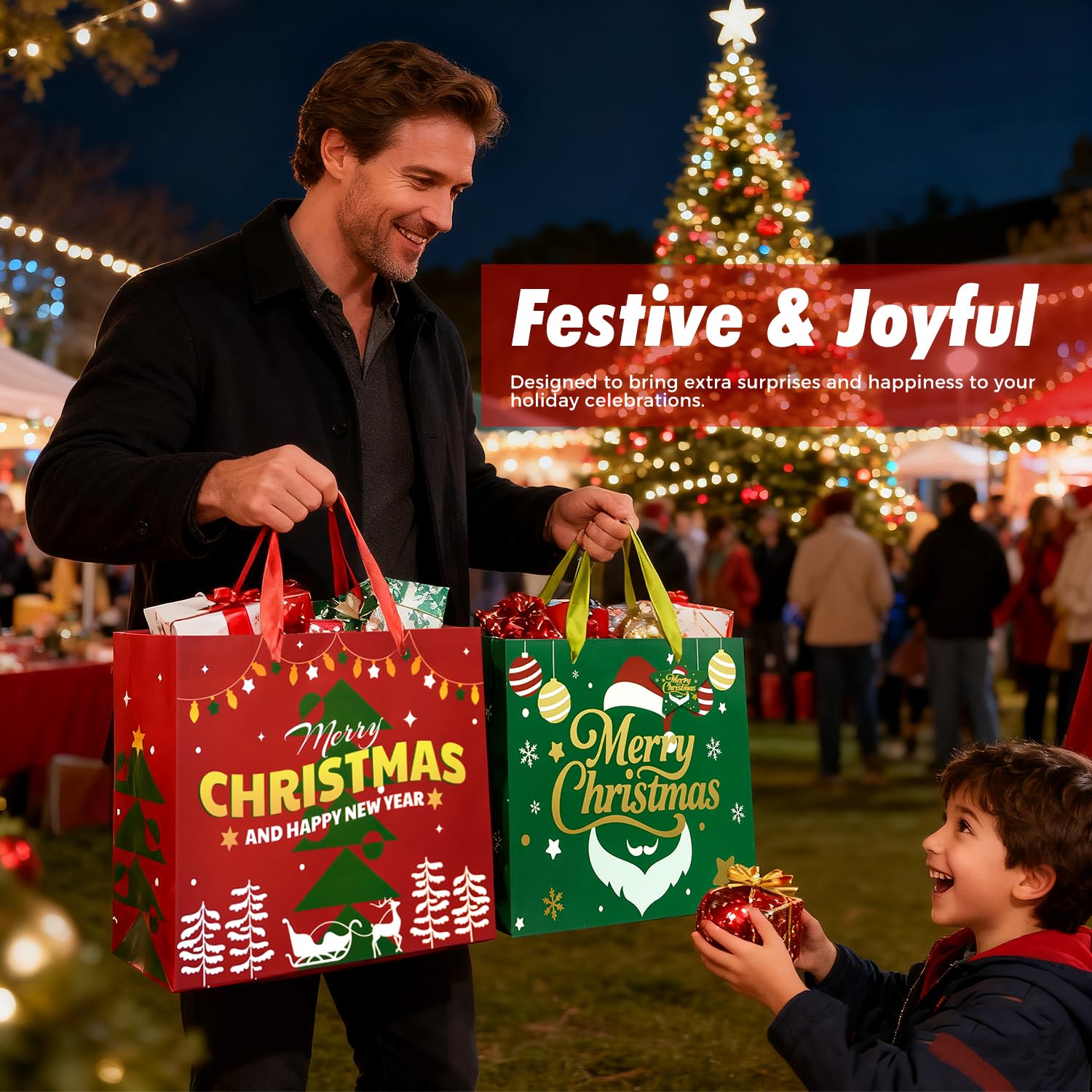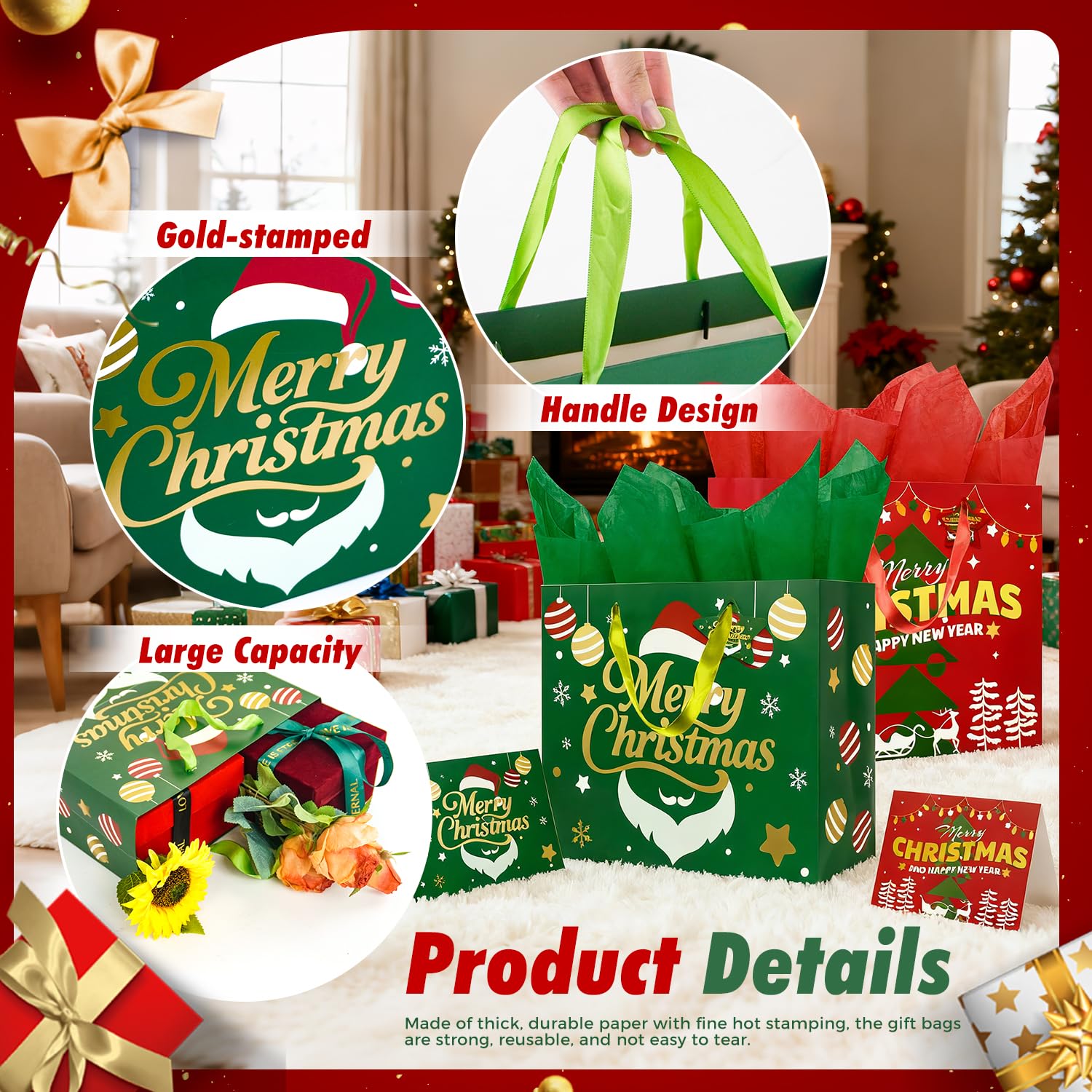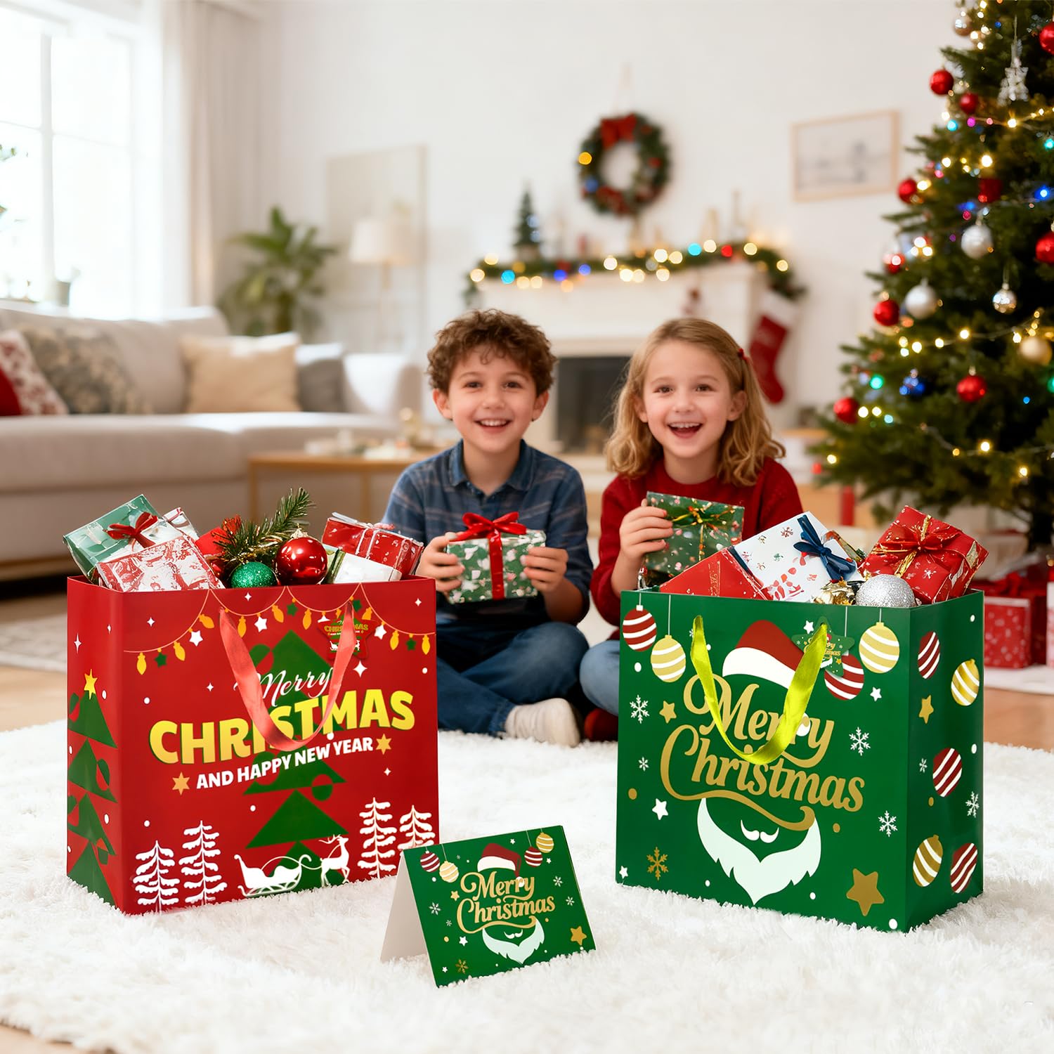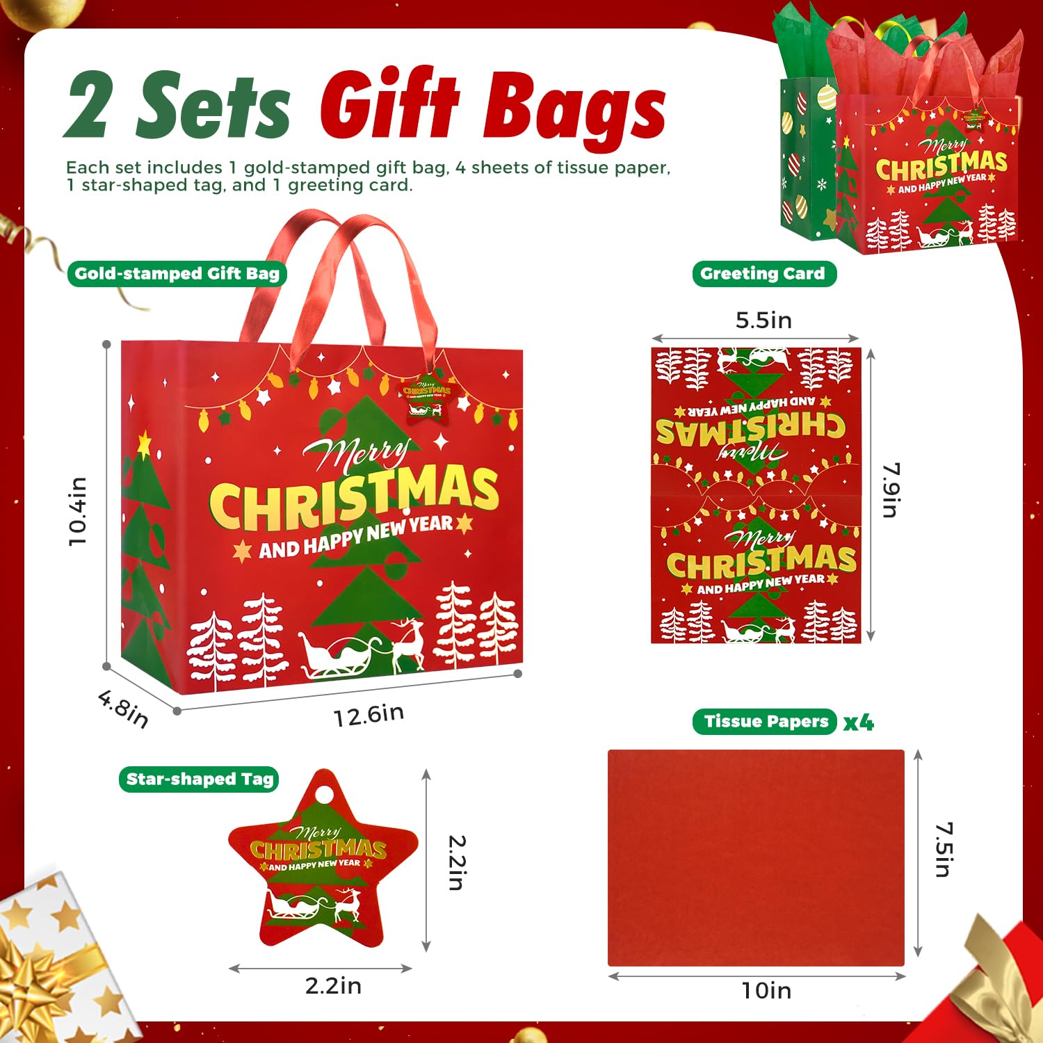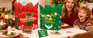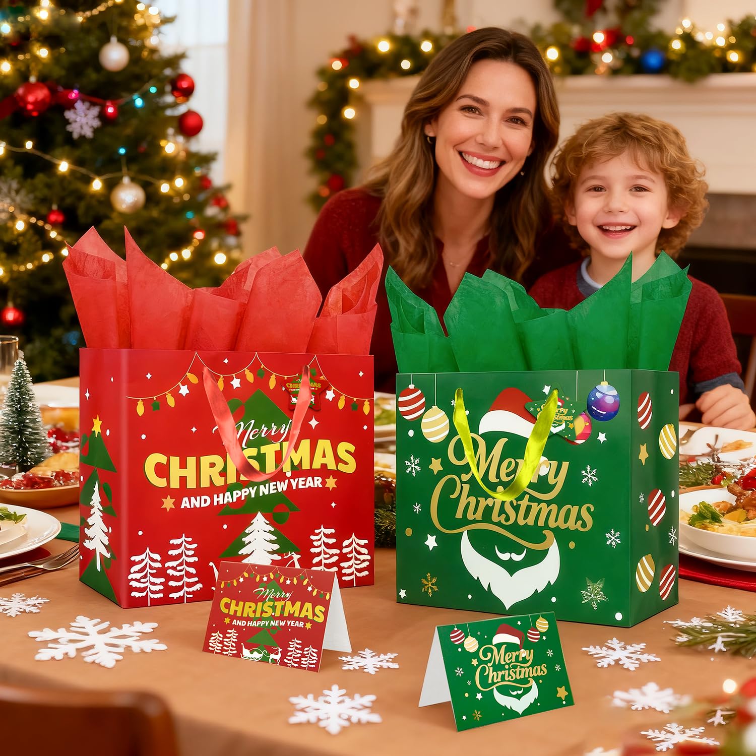 Christmas Gift Bags with Handles, Tissue Paper & Greeting Card