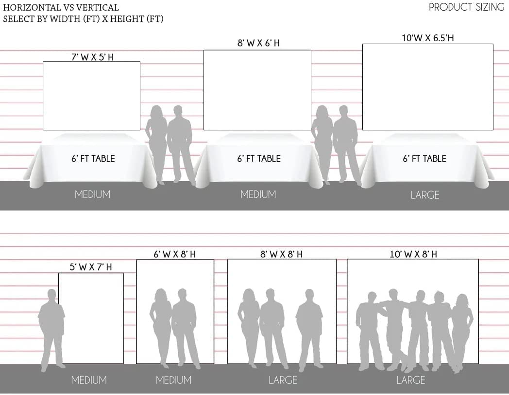 | Standard Size Example | 10x8ft (120″ wide x 96″ high); custom sizes available |