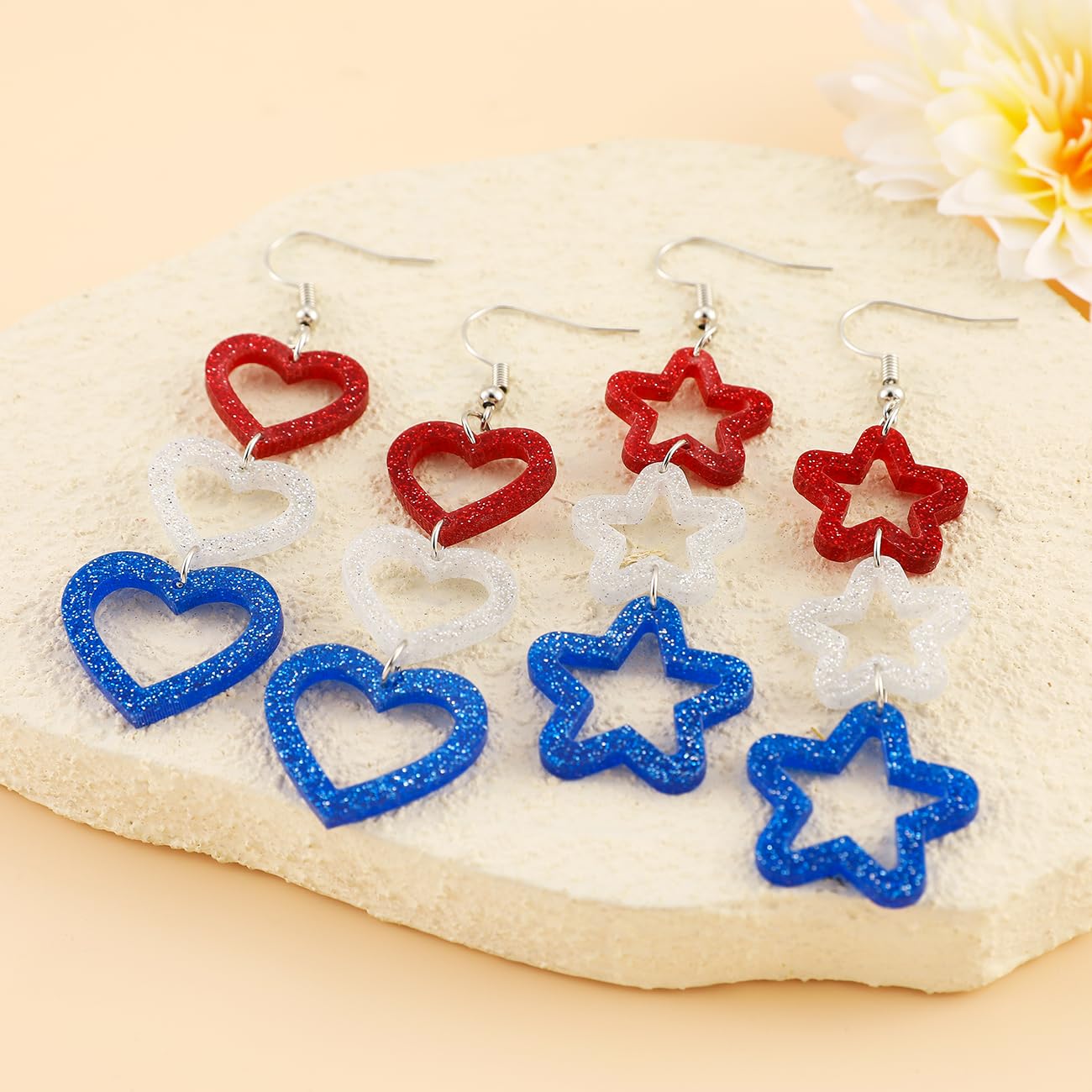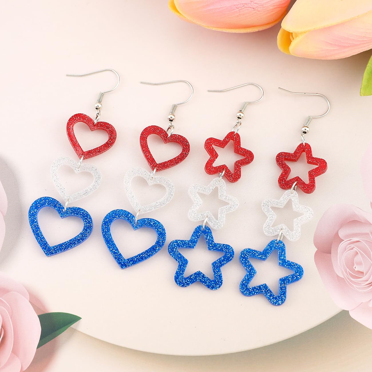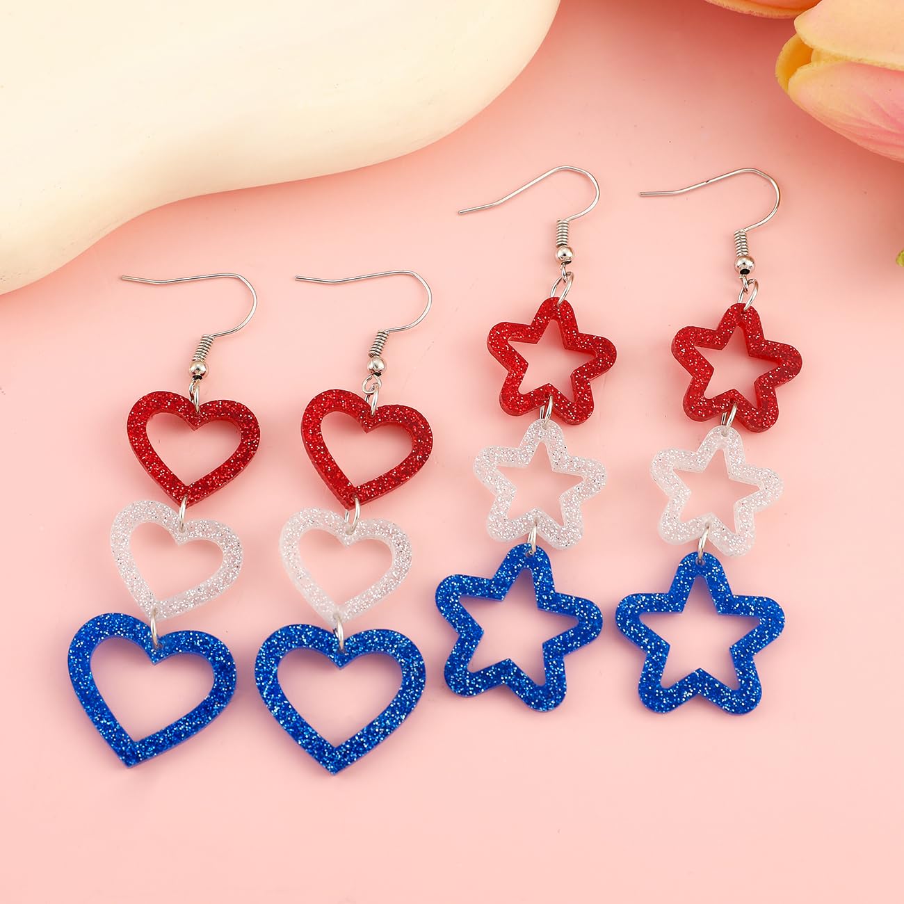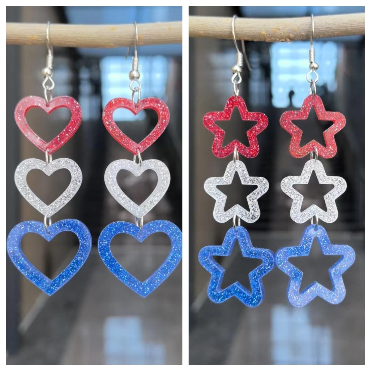 Lightweight acrylic patriotic party jewelry with heart & star dangle design. Custom earrings supplier offers OEM/wholesale options, supports custom patterns and styles.