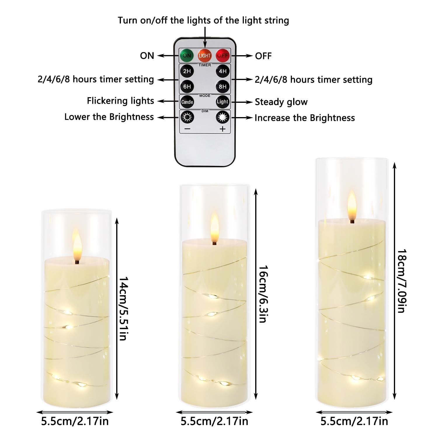 | Special Features | Remote controlled, timer (2/4/6/8H), 3-level brightness, flickering/steady modes, embedded fairy string lights |
