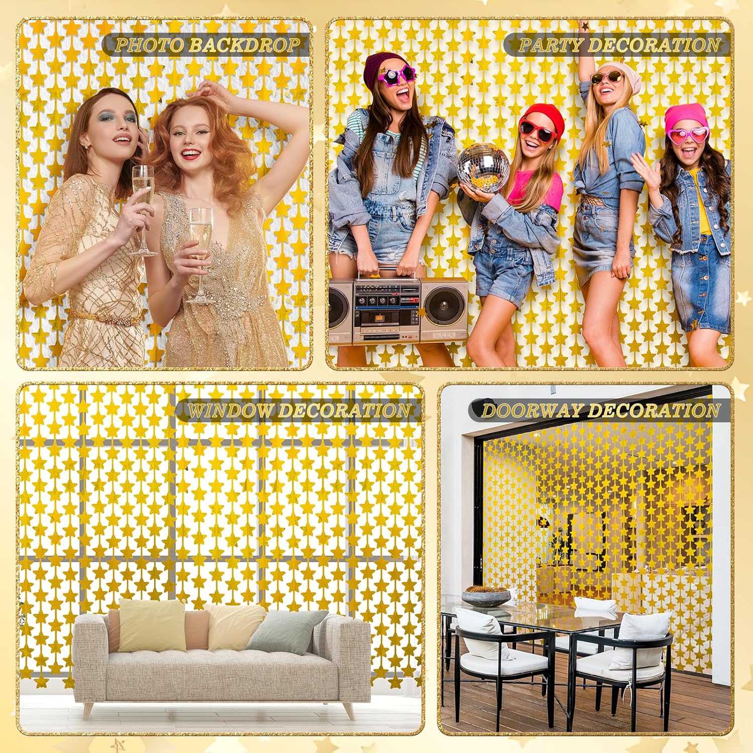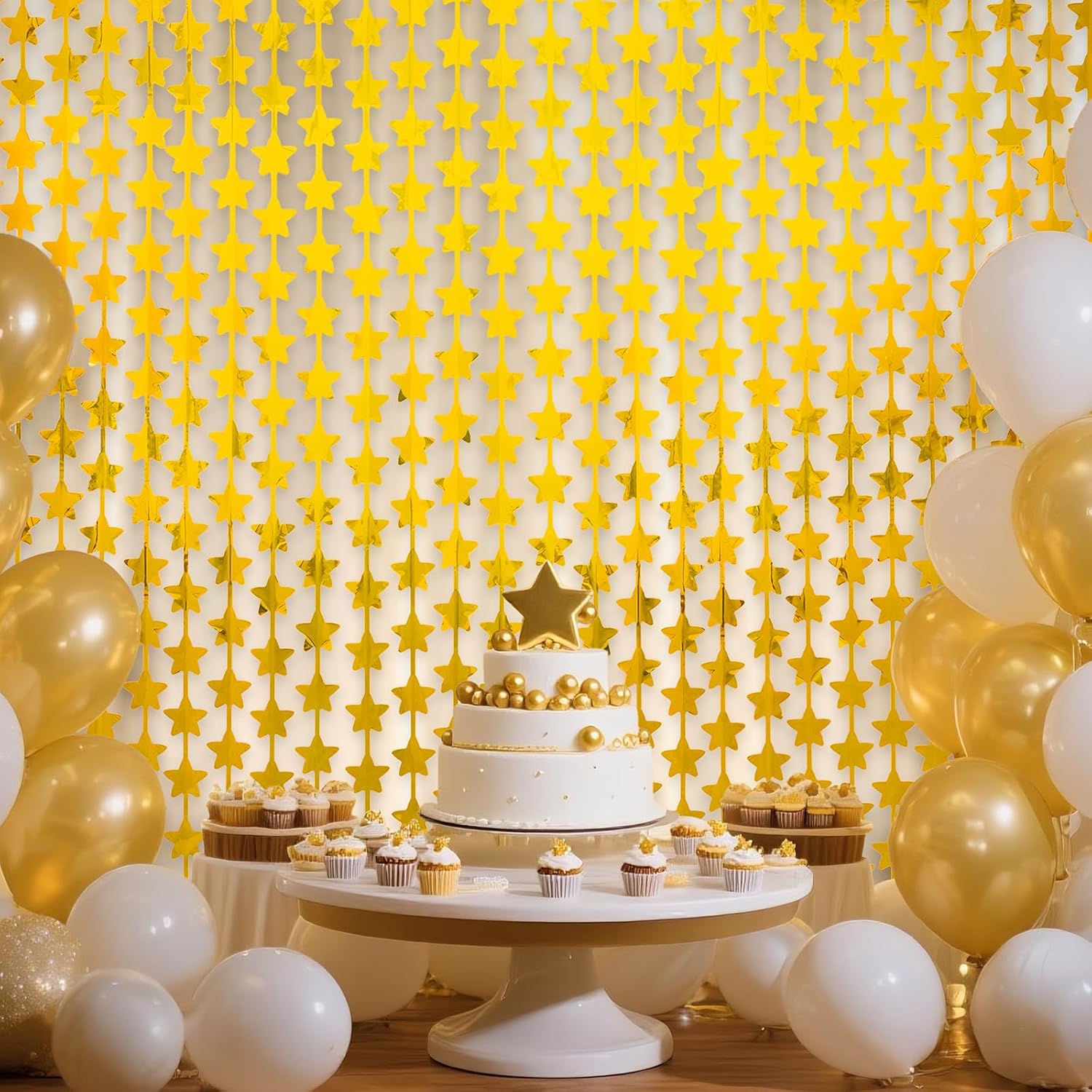 Shiny gold star foil fringe curtain with dense metallic stars for glamorous party backdrops. Ideal for birthdays, weddings, holidays. Customizable in any color combo (e.g., black & gold), size & density.