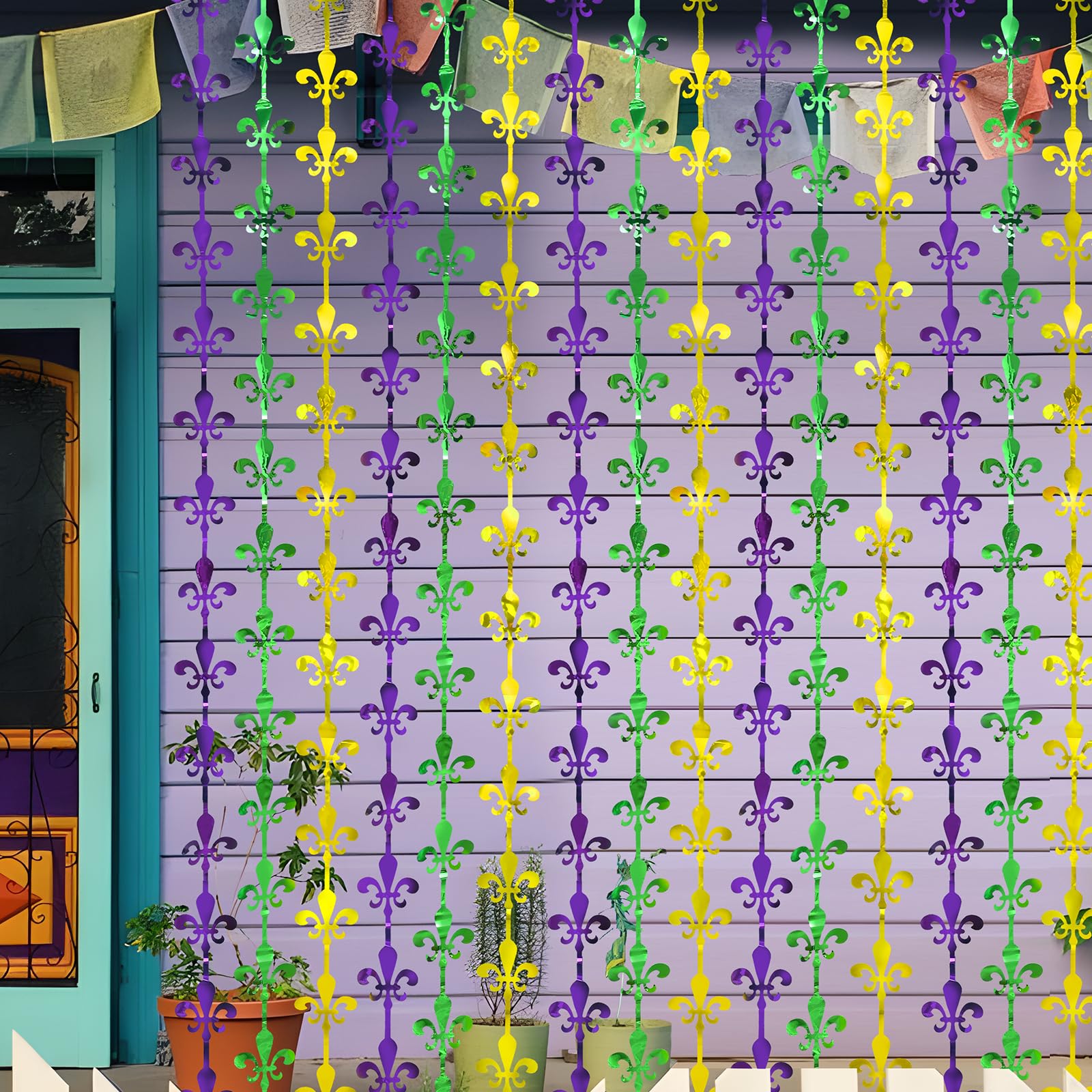 The foil curtain is a metallic tinsel fringe curtain measuring 6.6 by 6.6 feet per unit and supplied in packs of two. It features a purple-gold-green fleur-de-lis pattern and targets party retailers, event planners, and Mardi Gras venues that require consistent wholesale supply for seasonal decorations and event backdrops. This configuration supports procurement teams in maintaining stock levels that align with retail demand cycles and project-based orders.