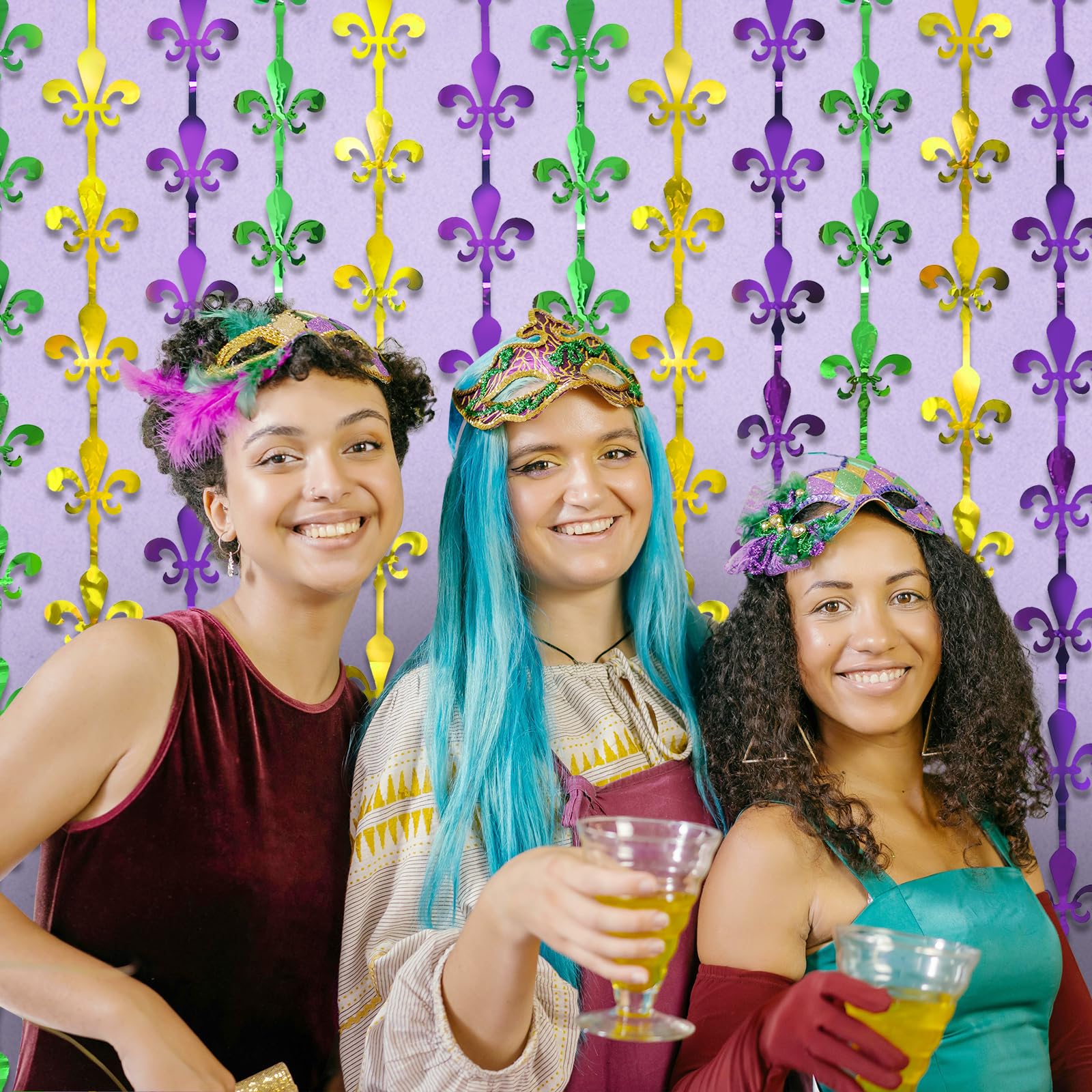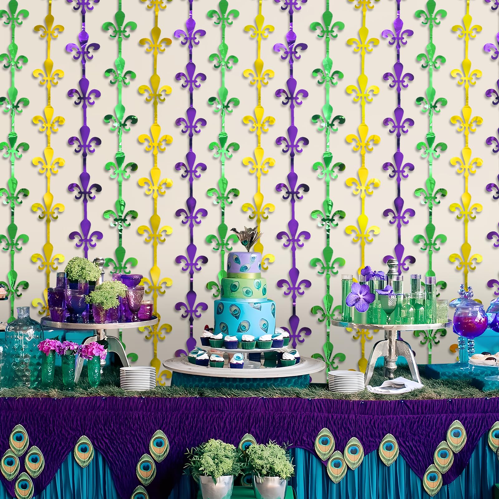 his purple gold green Mardi Gras fleur-de-lis foil fringe curtain decoration comes in a 2-pack, each panel 100cm wide by 200cm high with 12mm strips, made of high-shine foil with classic printed fleur-de-lis patterns, strong adhesive for easy installation, creating a professional party backdrop.We can customize the colors, sizes, patterns, strip width, packaging, and printing according to your needs to make your Mardi Gras or themed event more unique and on-brand.