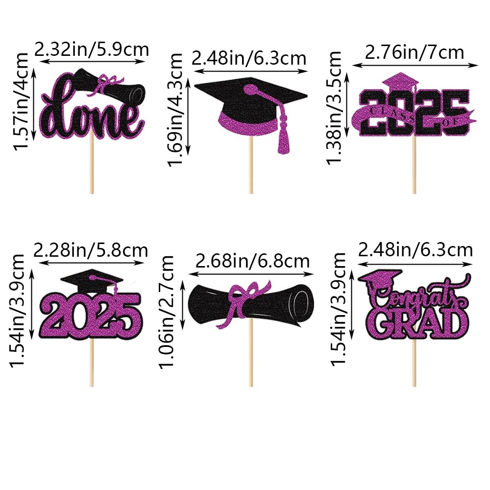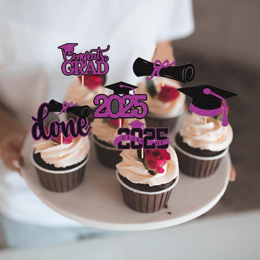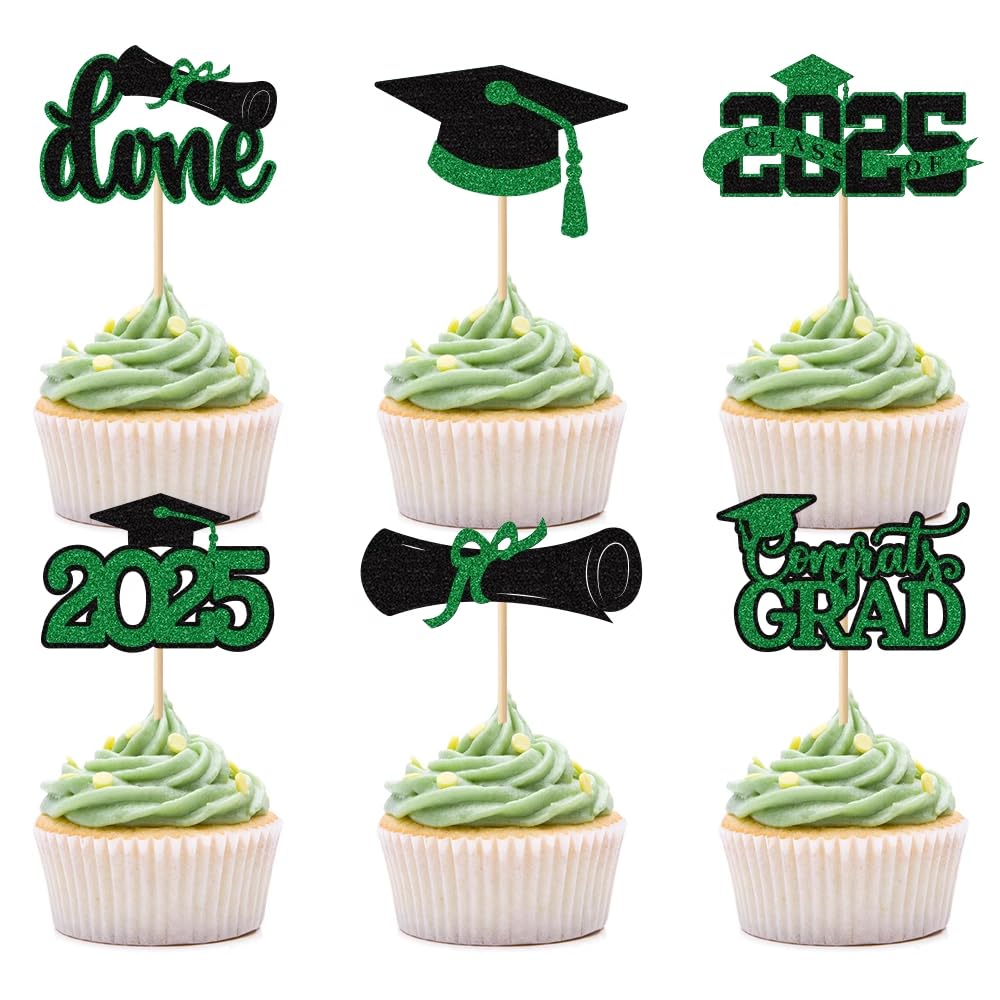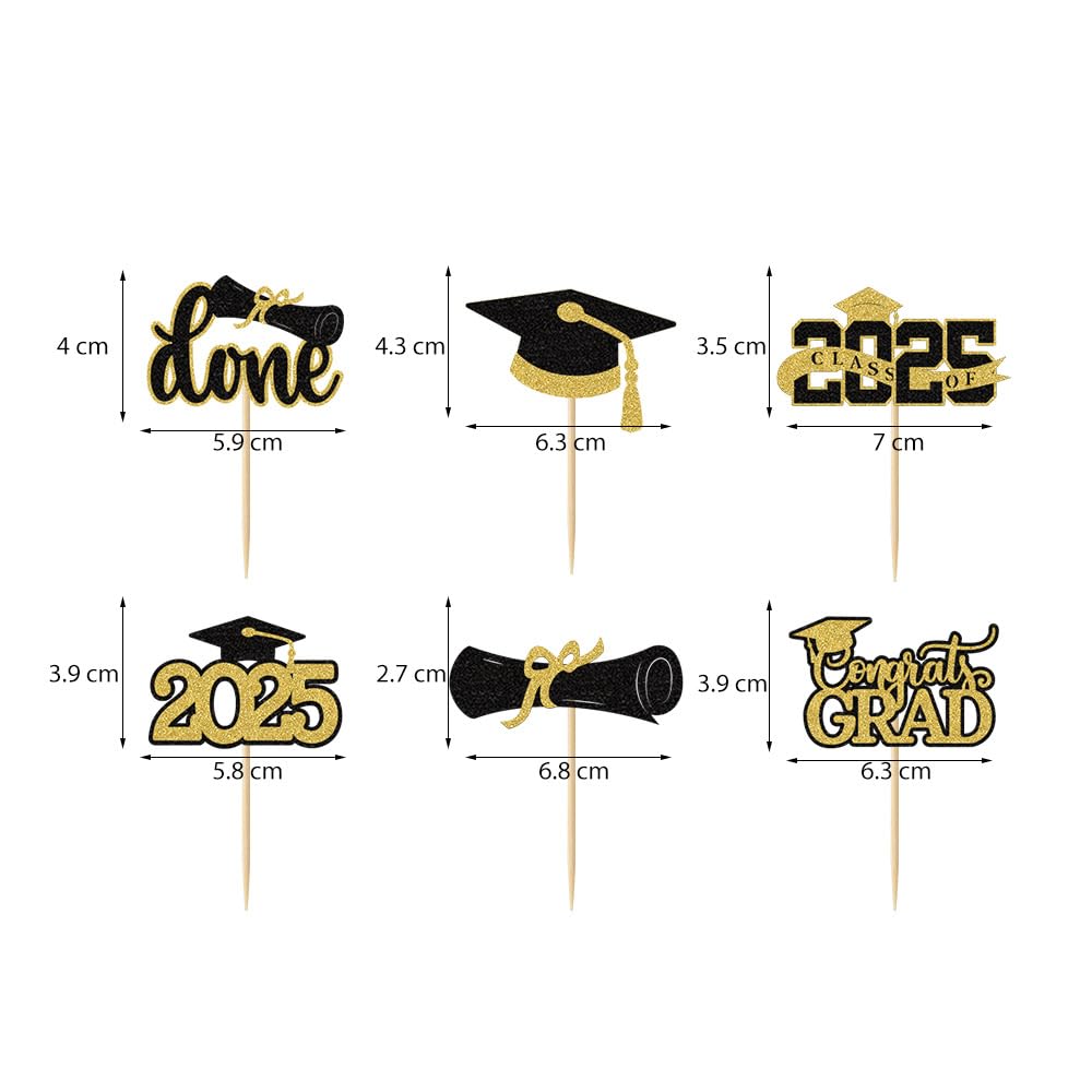 | Package Included | 24 pieces of Graduation Cupcake Toppers in 6 styles (Congrats Grad, Diploma, Cap, Done, etc.), 4 pieces per style. Pre-assembled for immediate use. |