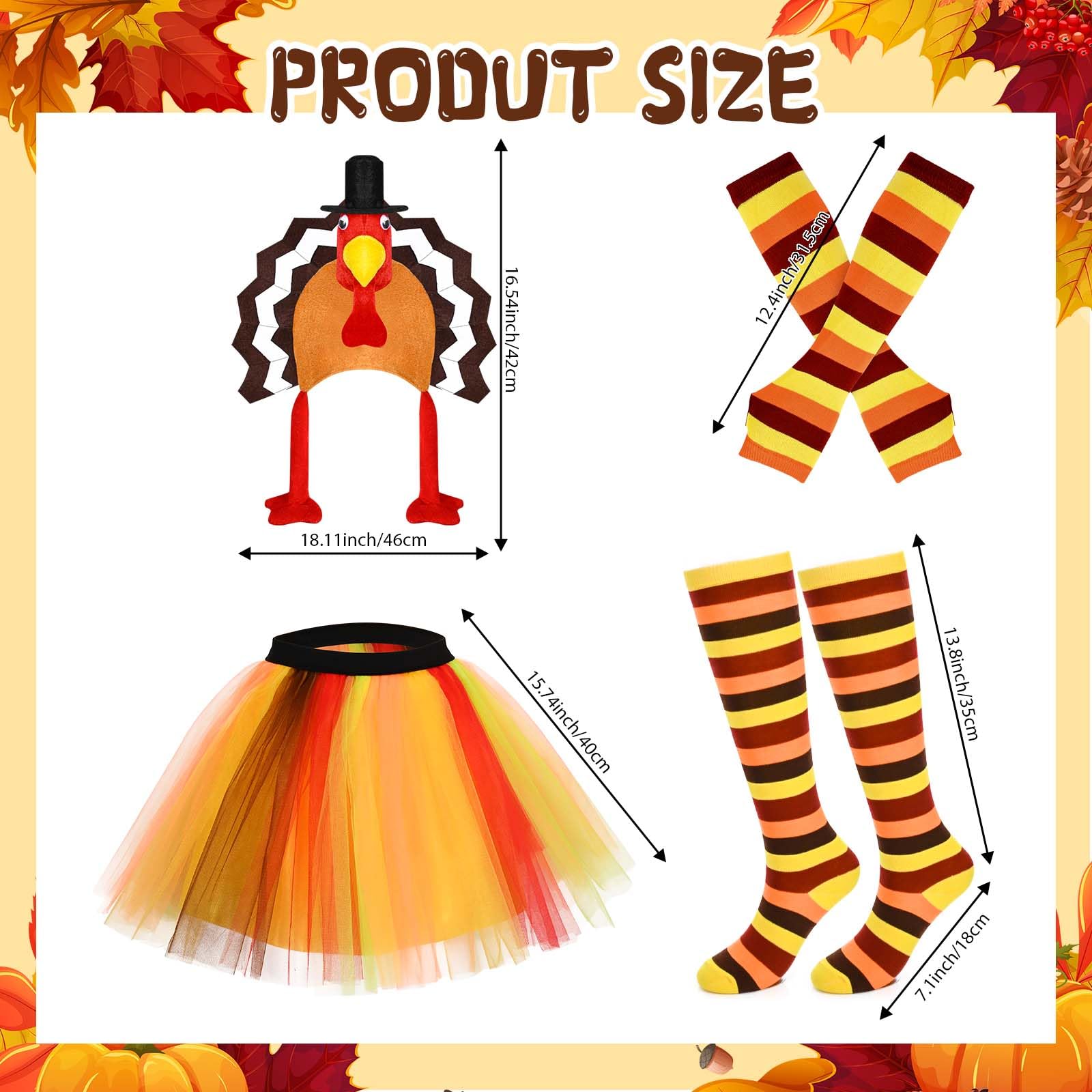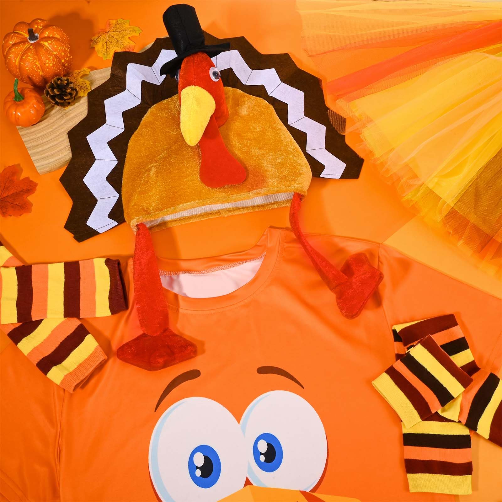 | Quantity | 5 Pcs (T-shirt, tutu skirt, turkey hat, knee-high socks, striped gloves) |