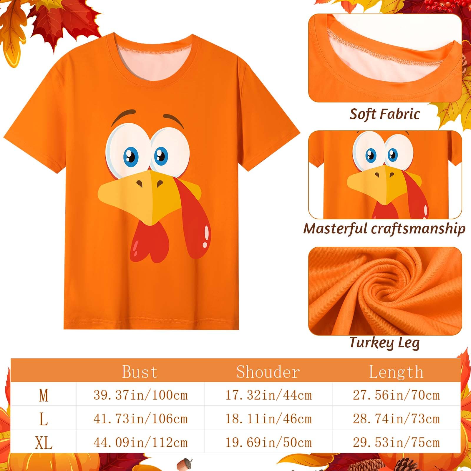 | Features | Breathable lightweight fabric, vivid turkey face print, comfortable fit |