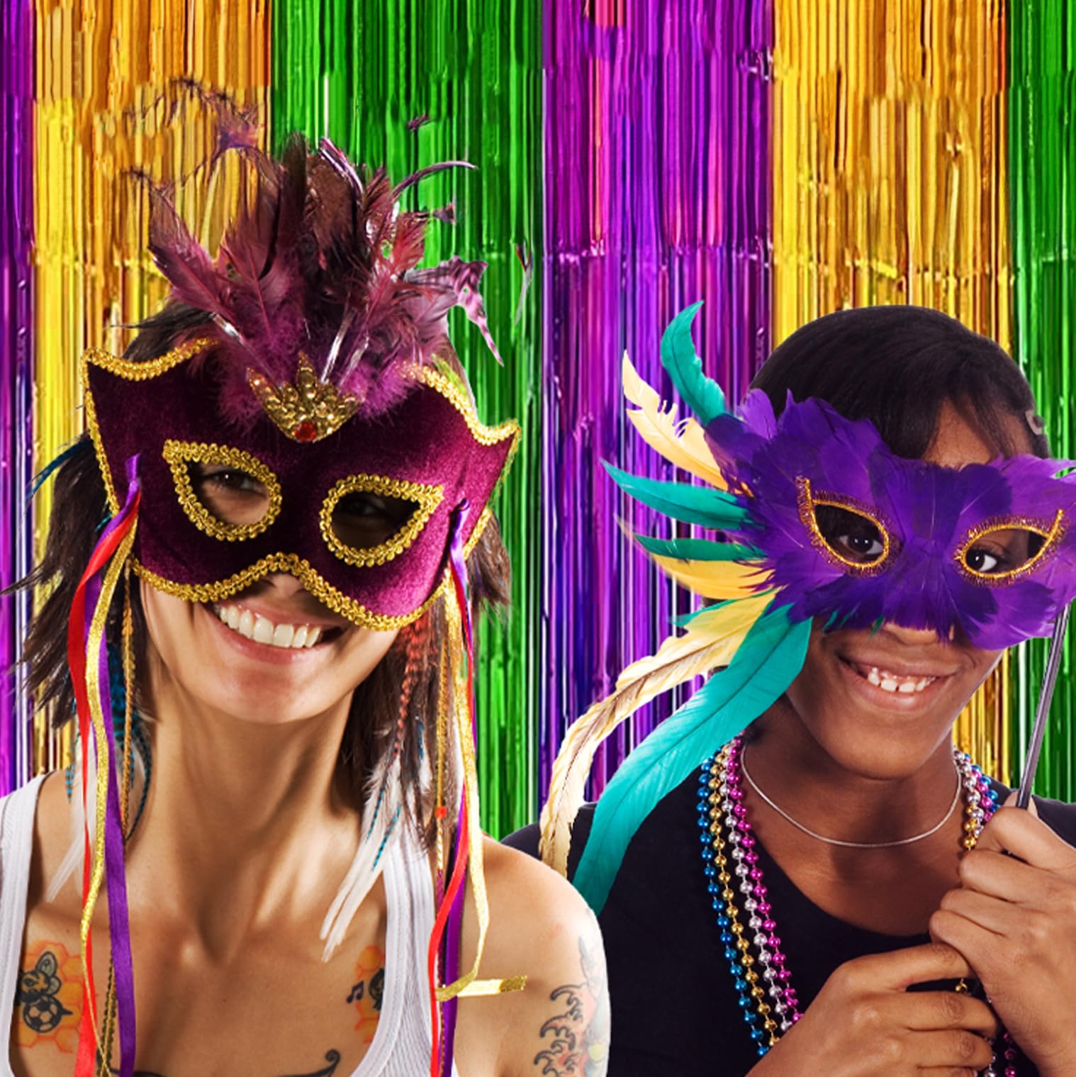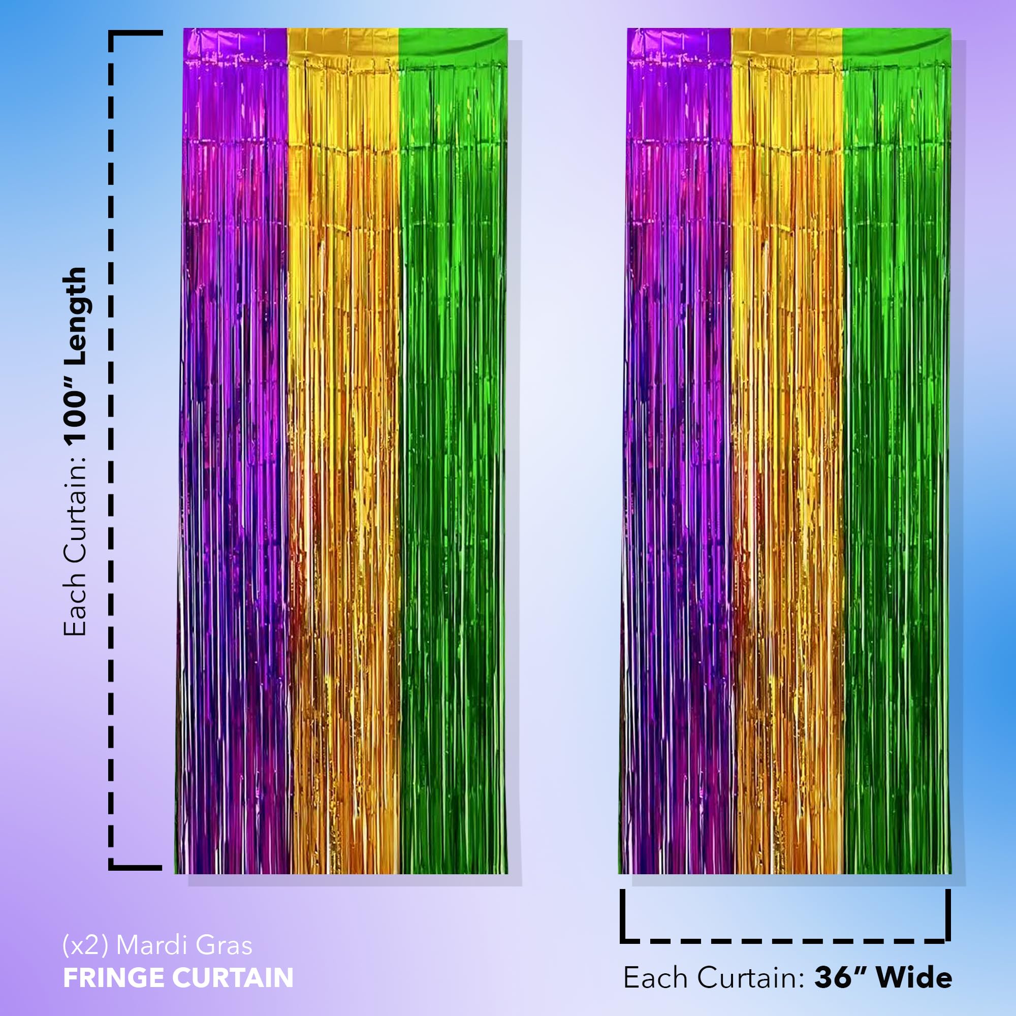 Mardi Gras tri-color metallic foil fringe curtain set with 2 self-adhesive panels totaling 80″W x 100″H per pack consists of two curtains each measuring 100 inches in length and 36 inches in width made from shiny metallic foil plastic strips for high-volume party and event decoration supply.