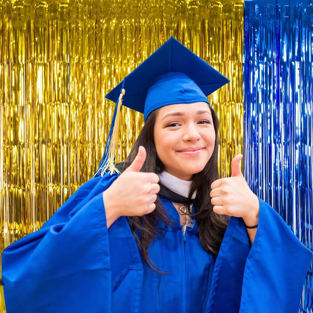 This one is our classic Red & Black Tinsel Curtain Backdrop. It comes with the “Class of 2026” banner and shiny metallic fringe curtains in bold red and black — super popular for graduation photos. We can totally customize this style, whether you want to change the year, switch the colors to your school colors, or even adjust the banner text.