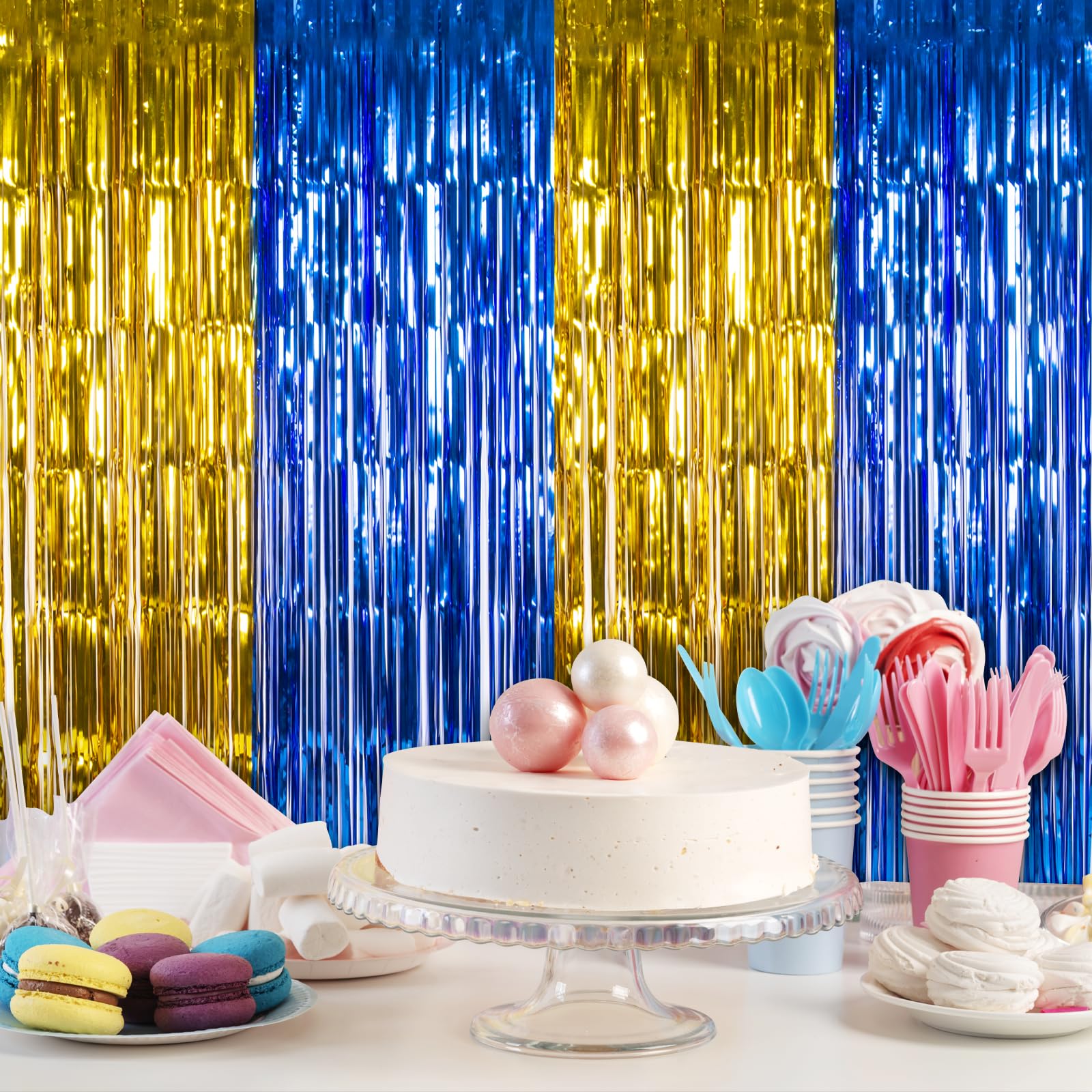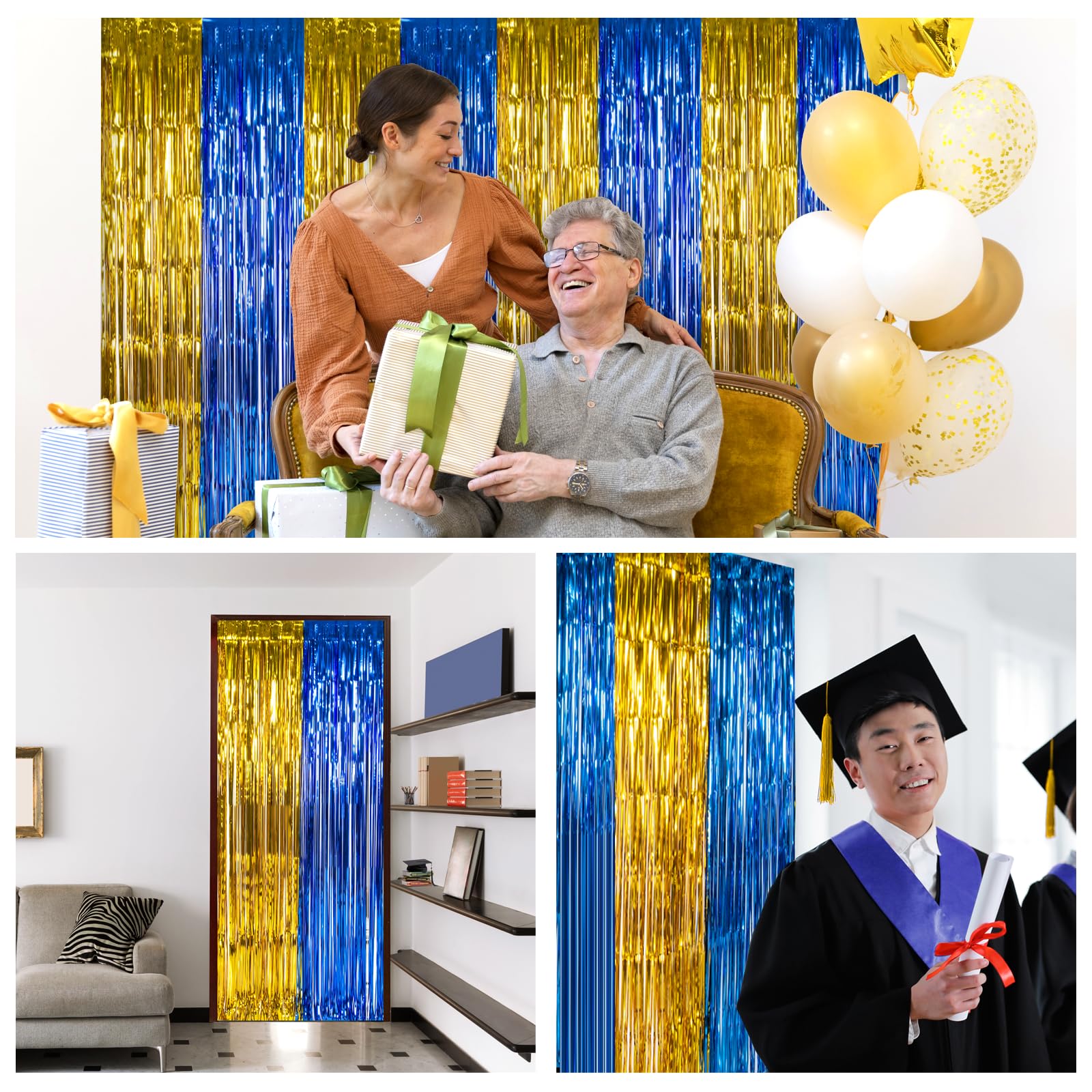 The party tinsel consists of a blue and gold metallic fringe backdrop curtain measuring 6.6 feet by 6.6 feet with an included CONGRATS GRAD banner and matching accessories. This curtain foil party product delivers a square coverage area of approximately 43.56 square feet and supports straightforward installation for event applications. Wholesale buyers such as party supply retailers, online sellers, and event planning businesses can stock this item to meet graduation season demand while maintaining consistent product availability for their customers.