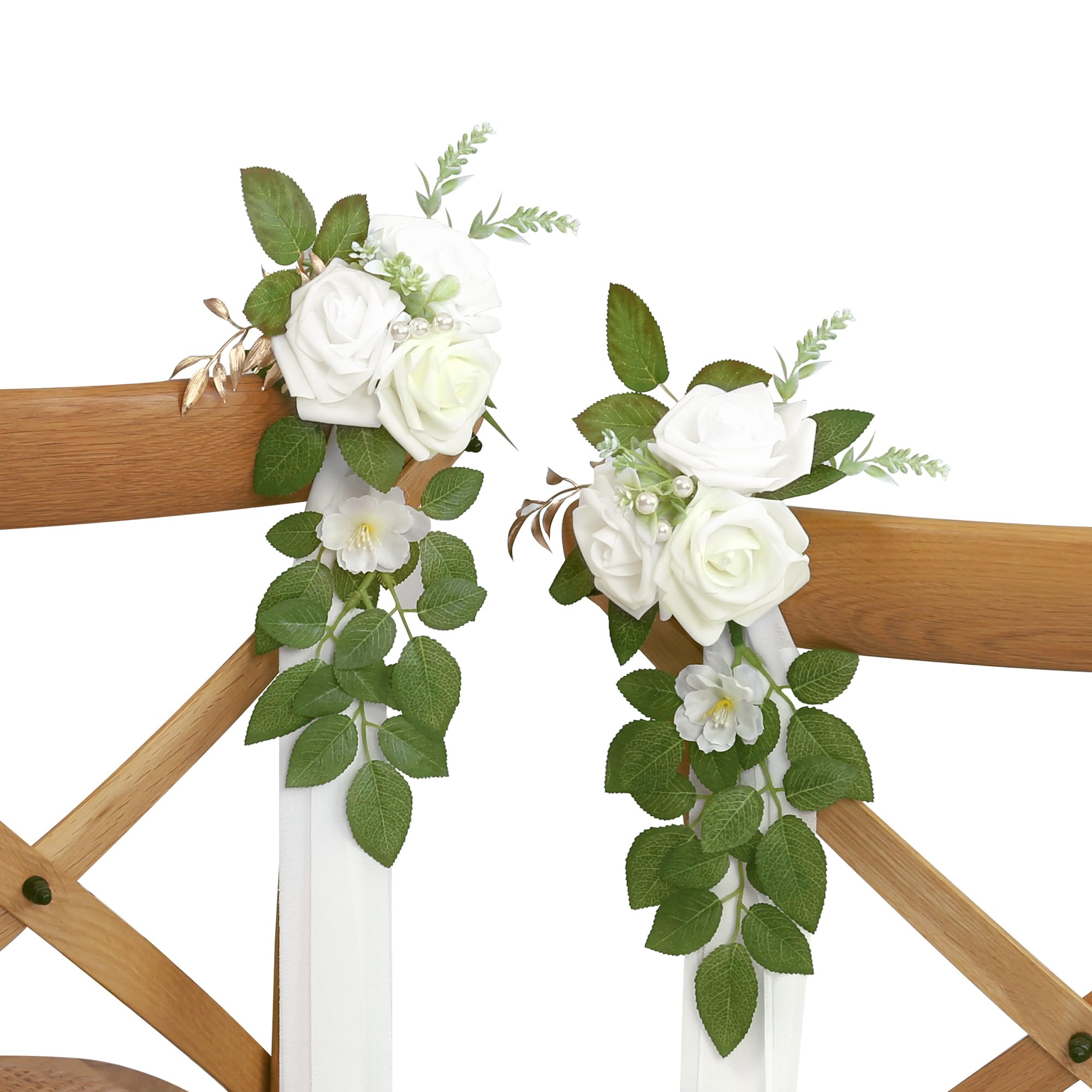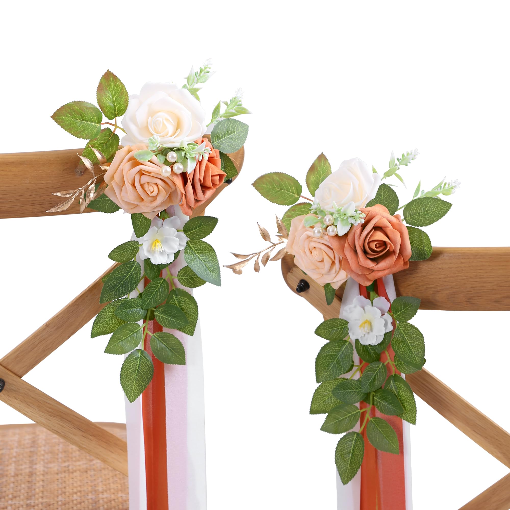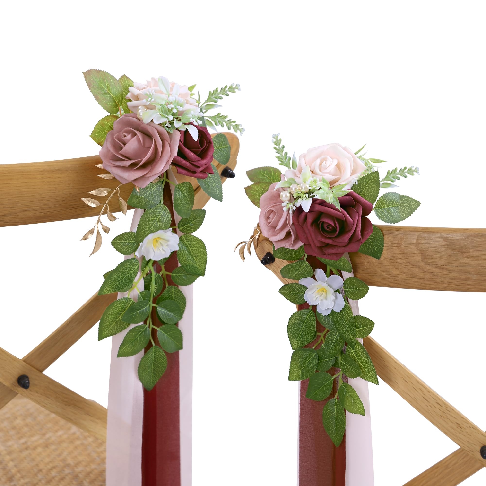 Material High-quality foam roses, artificial greenery, pearls, gold leaves, soft chiffon ribbons