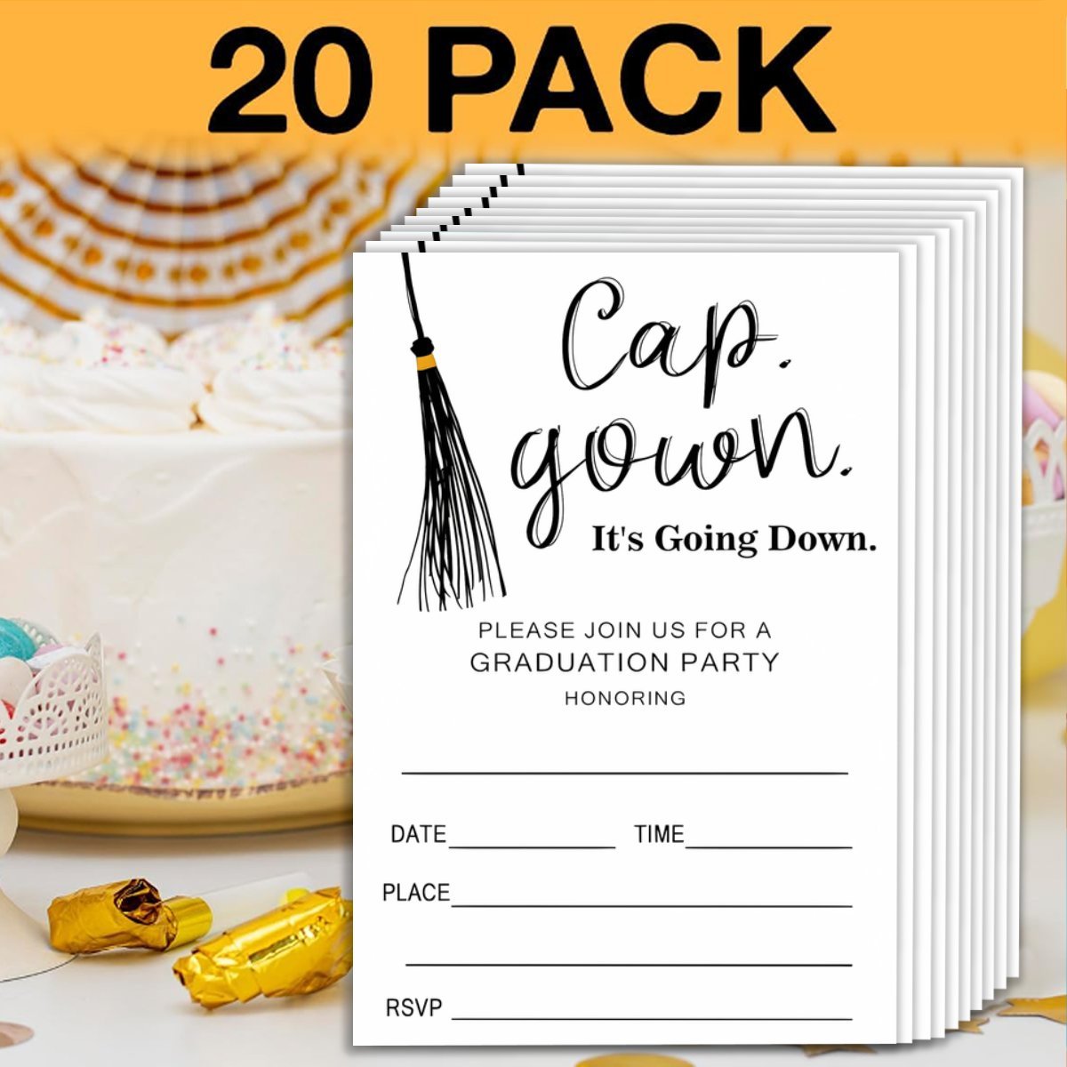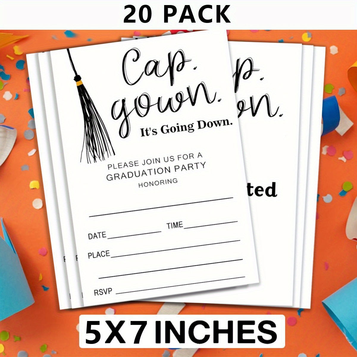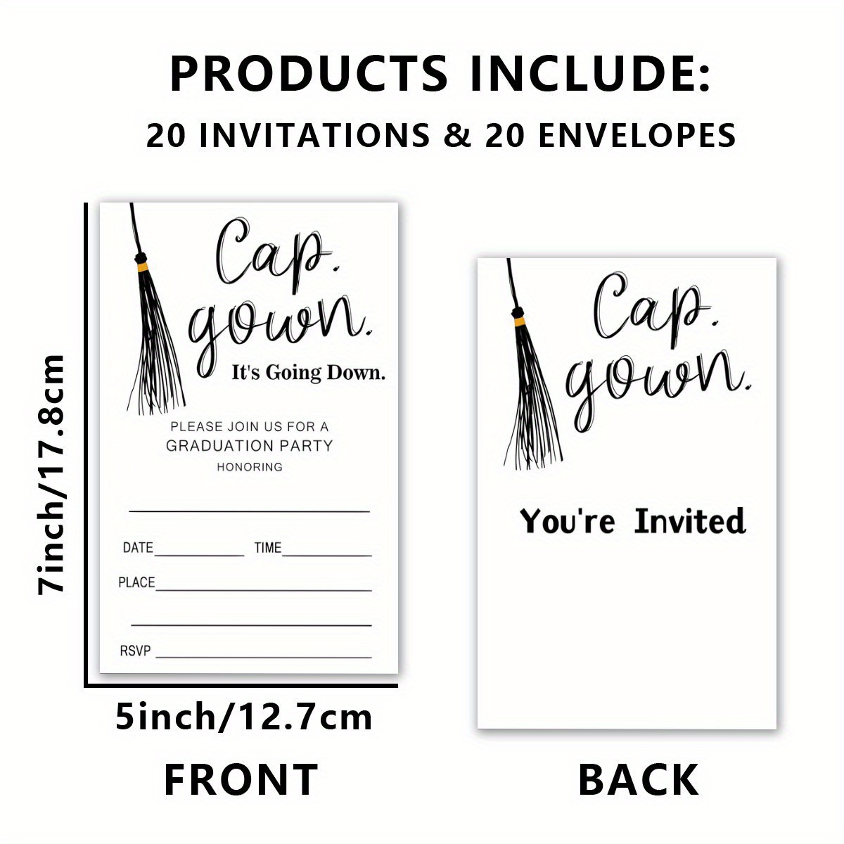 | Design | “Cap. Gown. It’s Going Down.” with fill-in fields for honoree, date, time, place, RSVP |