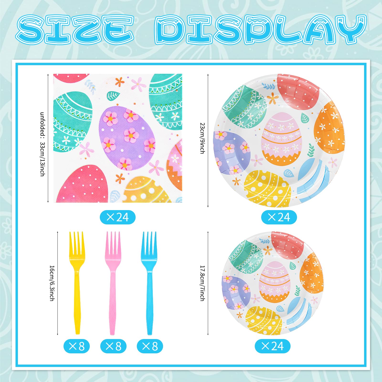 | Number of Pieces | 96 (24×9″ plates, 24×7″ plates, 24 napkins, 24 forks) |